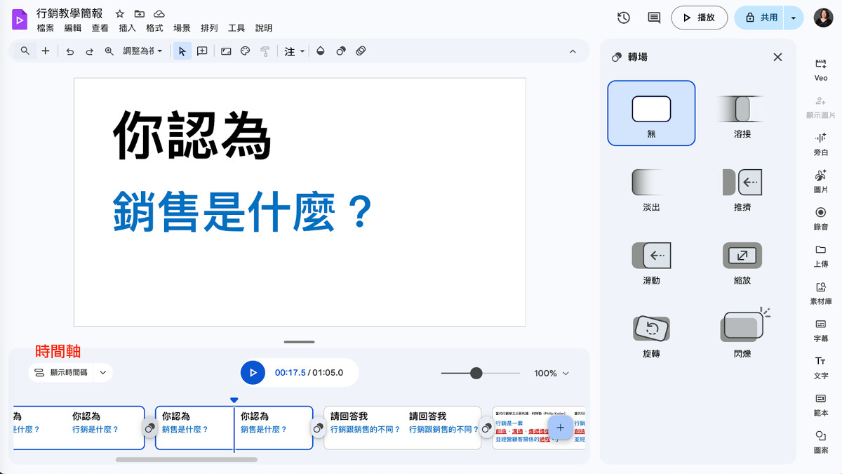 匯入之後,會出現時間軸,就可以像做影片一樣來安排每一張投影片的長度及轉場、動畫等等。