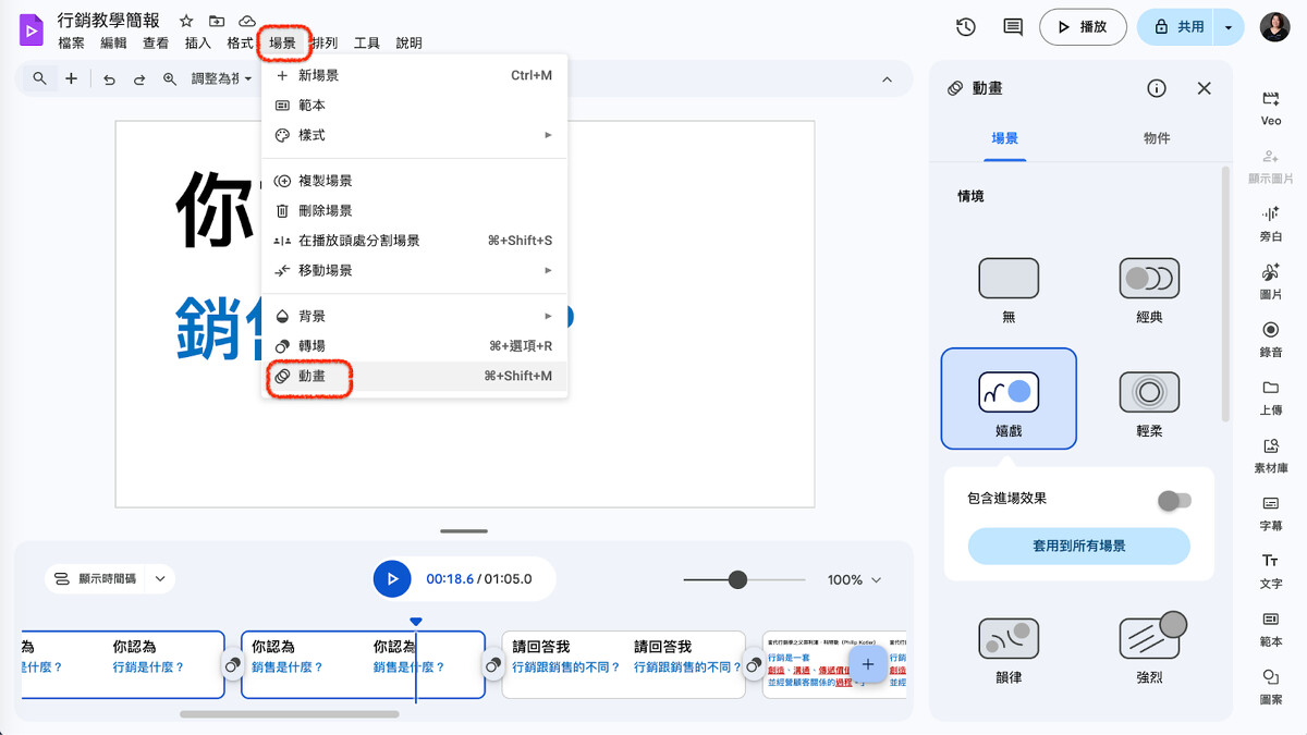 想要讓投影片上的字動進來,可以點上方選單的「場景」→「動畫」。