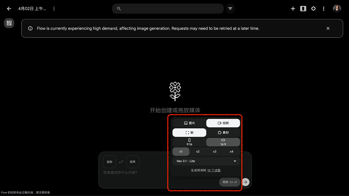 在對話框右下角,可以選擇要生成圖片或影片、影片尺寸、一次要生成的數量,以及使用什麼模型。並且會有此次生成預估的消耗點數。