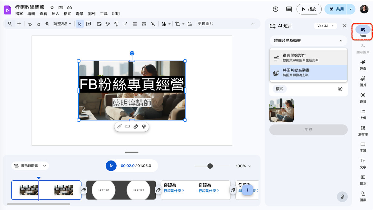 此時調用的工具是右手邊選單的 Veo(Google 的 AI 生成影片工具),可以將圖片變為動畫。如果你想憑空生出一段 AI 短片,也是從這個功能進入,選擇「從頭開始製作」。