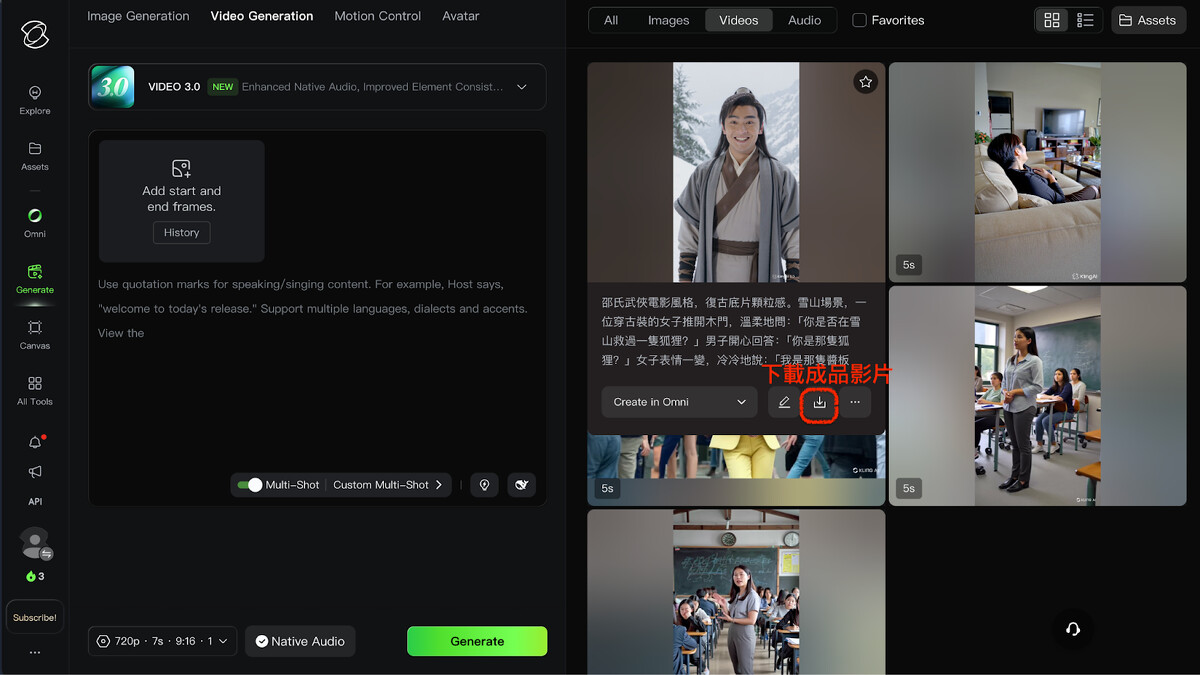 Kling 不只成功還原了古裝場景和雪山氛圍,角色還真的會開口說中文台詞,對嘴也相當自然。這個時代,人人都能當導演真的不是說說而已。
