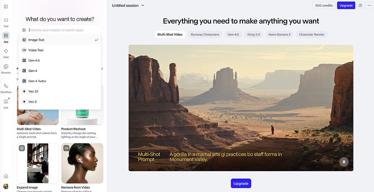 下方還有多個 Featured Apps(精選應用),像是『Multi-Shot Video』可以用一段提示詞生成多鏡頭影片、『Product Reshoot』可以上傳產品照一鍵更換背景和燈光、『Expand Image』可以擴展圖片範圍等,免費註冊後有 500 點額度可以試玩。