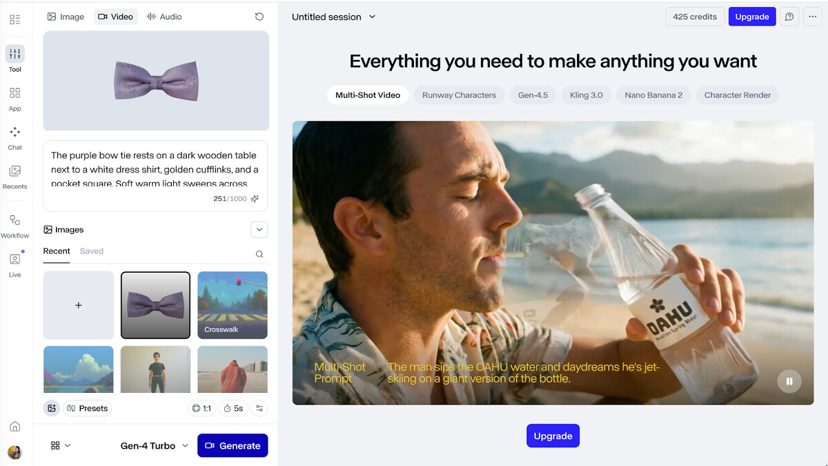 上方切換 Image/Video/Audio 三種生成模式,選擇 Video 後,可以上傳產品照片,在下方輸入提示詞描述想要的場景和鏡頭效果。底部可以調整畫面比例(1:1、16:9 等)和影片長度(5 秒或 10 秒),確認後按下 Generate 就會開始生成。目前使用的模型是 Gen-4 Turbo(免費版僅支援此模型)。