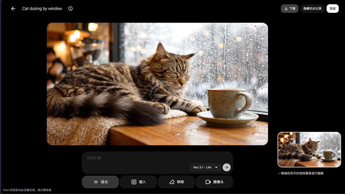 舉例,我生成「一隻貓在雨天的咖啡廳窗邊打瞌睡」的 AI 短片,生成後還可以持續修改。