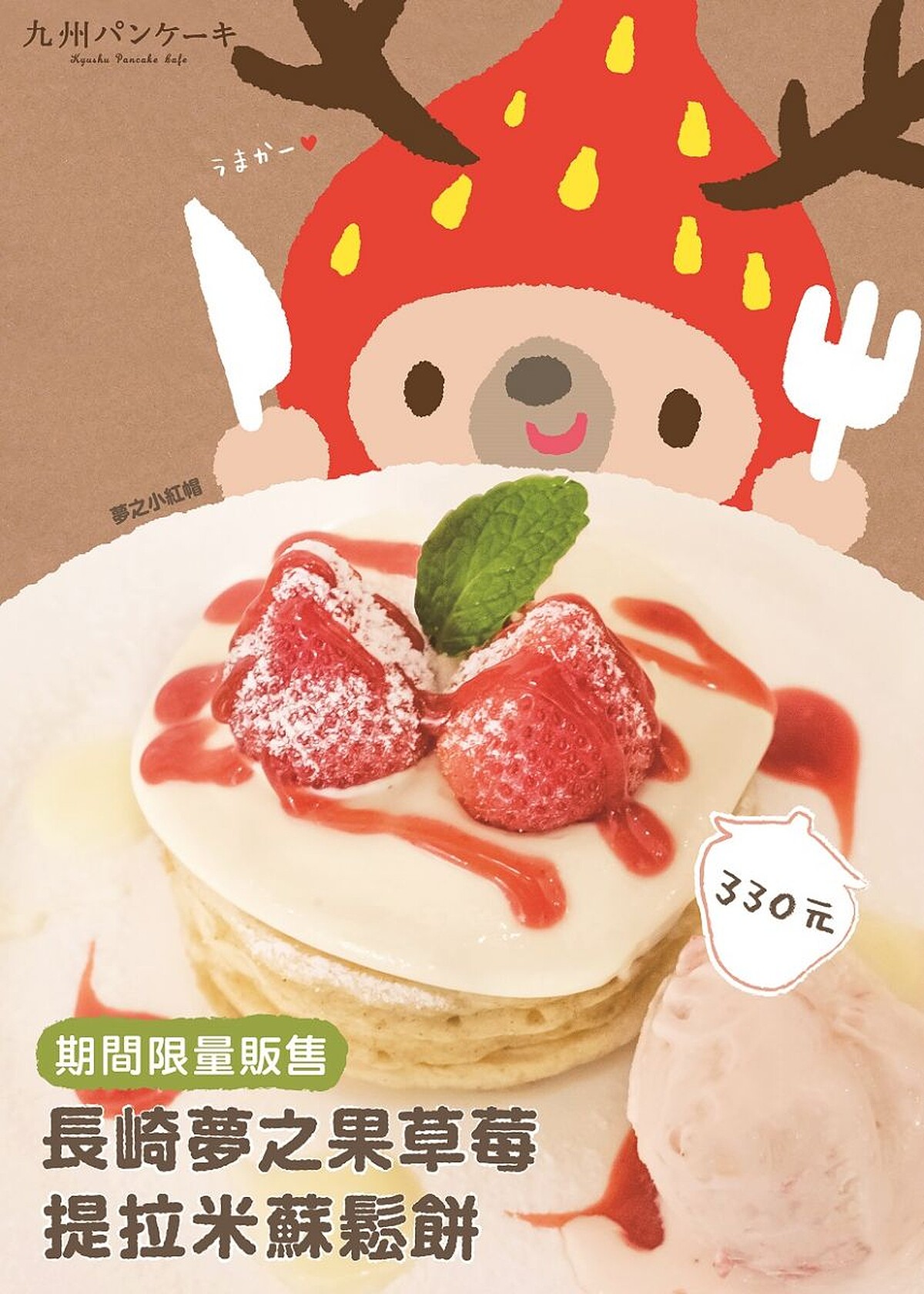 LIFESTYLE美食11天快閃限定!九州鬆餅新口味「長崎夢之果草莓提拉米蘇鬆餅」春天就是要吃草莓啊!九州鬆餅最新推出「長崎夢之果草莓提拉米蘇鬆餅」,兩顆飽滿鮮甜的草莓空降於馬斯卡彭起司上,層層紮實Q彈的七穀原味鬆餅搭配濃郁果泥夾層,最後滾上一球草莓口味冰淇淋於盤中,幸福口感無法言喻。by Ren-2020/05/06更新Edit / Ren Photo / Kyushu Pancake九州鬆餅『夢之果草莓』之所以有它的美名,是因為它代表著『夢幻果實般的草莓』,酸甜均衡、軟硬適中,草莓控千萬不能錯過,「長崎夢之果草莓提拉米蘇鬆餅」期間限定只有3月21日起至3月31日販售,每日限量30份,售價NT$ 330,可要好好把握時間啊!