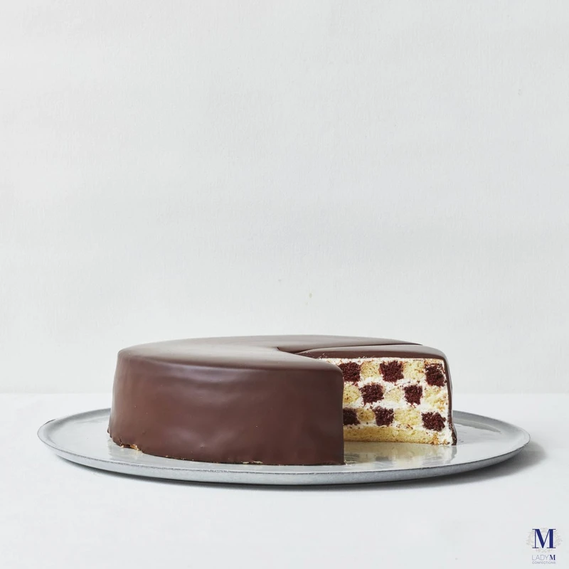 以香草蛋糕與巧克力蛋糕編織成黑白棋格圖騰,黑白棋格間交織著輕盈鮮奶油,蛋糕外層裹以黑巧克力甘那許,為熱門點購買品項。