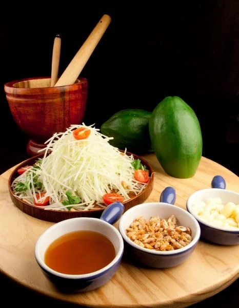 最後介紹一道酸辣鮮甜、清爽開胃的現拌泰式青木瓜絲,以流動水流沖出清脆口感的青木瓜絲,接著將大蒜、辣椒、朝天椒、小蕃茄、乾蝦米、乾花生一同放入木缽搗碎,再拌入以魚露、新鮮檸檬汁、椰糖及泰式香料製成特調醬汁。