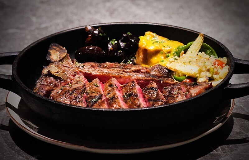 「28天乾式熟成丁骨牛排 Aged 28-day T-Bones 22oz」是以自製熟成室熟成美國進口牛肉,肉質軟嫩多汁、保留更多水份,再經由 JOSPER 烤箱使表面高溫上色,以煙燻白橡木碳香味混合,每一口都充滿牛肉本身的原味及燻烤香氣,佐以自家農場栽種的蔬果解膩,兩者的完美搭配使口感層次更為豐富。