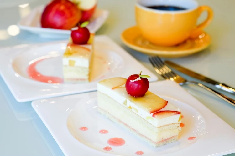 【甜蜜波特起司蛋糕】愛心造型將甜蜜之意表露無疑,「甜蜜波特起司蛋糕」以白戚風蛋糕為底,塗抹由日本青森蜜蘋果、柳橙汁、鹽之花一同熬煮而成的果醬,疊上包覆蘋果泥的乳酪卡士達,擁有讓人一口接一口停不下來的魅力。