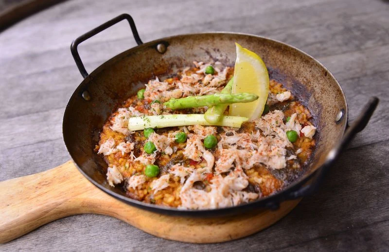 除了大鍋鍋物,還有許多配菜料理可以選擇,像是西班牙米血腸燉鮪魚鍋、白豆慢燉牛尾鍋、雞肉卷搭配蒙切哥起司、濃厚蟹膏的蟹肉風味烤飯、還有超彈嫩又酥脆的酥炸海鮮等等,一吃就愛上西班牙料理,快點去訂位吧。