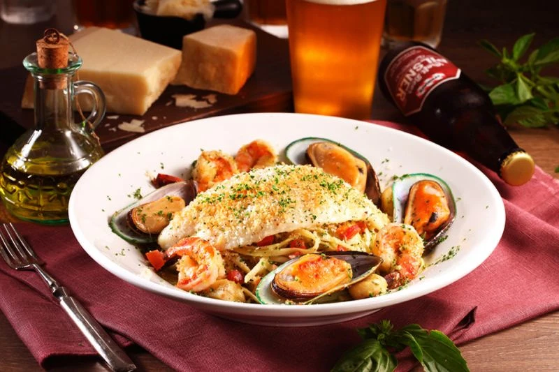 使用清爽青醬搭配FRIDAYS精釀皮爾森啤酒製作的皮爾森海鮮義大利麵,與淡菜、蝴蝶蝦、蕃茄、烘烤大蒜與義大利細麵一起拌炒,加上鮮嫩焗烤魚排,口感清甜微酸。