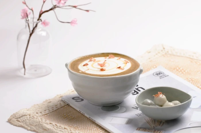 「落櫻焙茶歐蕾」以低咖啡因的焙茶為底,將櫻花與茶香完美結合,再融入濃醇鮮奶和龍眼蜂蜜,增添茶香尾韻的厚實感。濃醇的奶泡灑落鹽漬櫻花瓣,鹹甜的新口感超級值得品嚐!隨茶飲還附上小巧可愛的芝麻湯圓,可放入歐蕾中,讓芝麻香氣伴隨櫻花,變化出豐富層次口感。