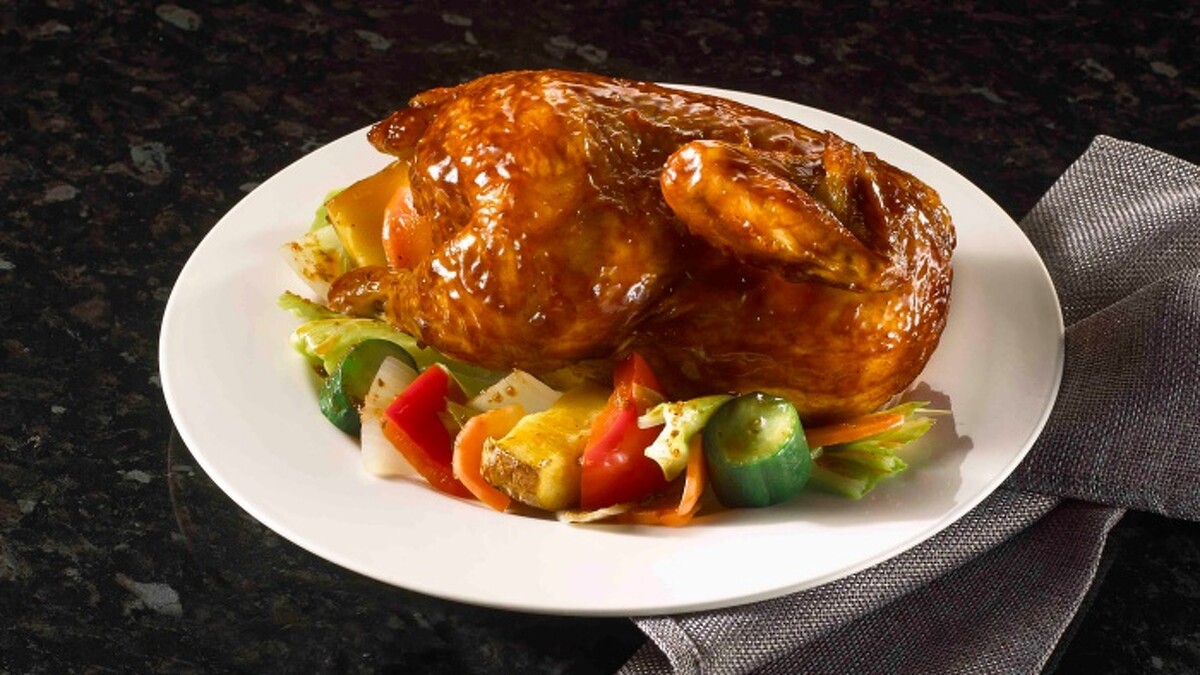 烤雞先以匈牙利紅椒粉、辣椒粉、黑胡椒粉、義大利香料、月桂葉、蒜頭等食材均勻塗刷在新鮮嫩雞上並按摩入味,再經過180°C獨家技術烘烤而成。添加歷經十年陳釀的香醇梅醬,加入陳年巴薩米克醋、檸檬汁及磨細的陳年梅子果肉共同熬煮。再搭配青花菜、小番茄、洋蔥、紅蘿蔔、地瓜、杏鮑菇等綜合鮮蔬,提升口感層次與均衡營養。