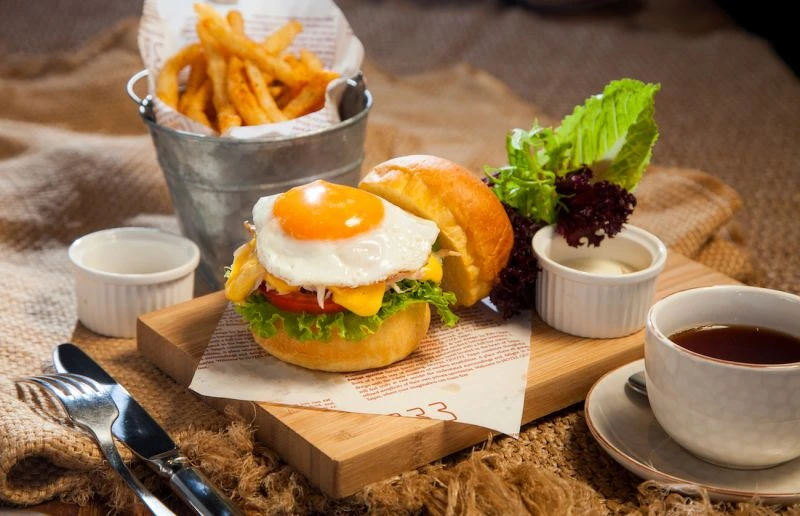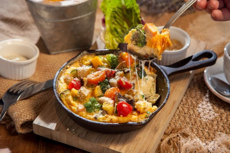 各式以蛋為料理主軸,爐烤野菇炒蛋、經典火腿班尼狄克蛋、慢燉茄汁牛肉醬麵與太陽蛋、煙燻雞肉野菜義大利烘蛋等,把各種烹調方式製作的蛋料理完美呈現,還有受到少女喜愛的鄉村楓糖法國吐司以季節水果點綴,無限量供應沙拉吧,也有滿滿的紅綠捲生菜、蘿蔓葉、小豆苗等5至6種生菜及熟地瓜等,完全是早午餐迷的天堂!