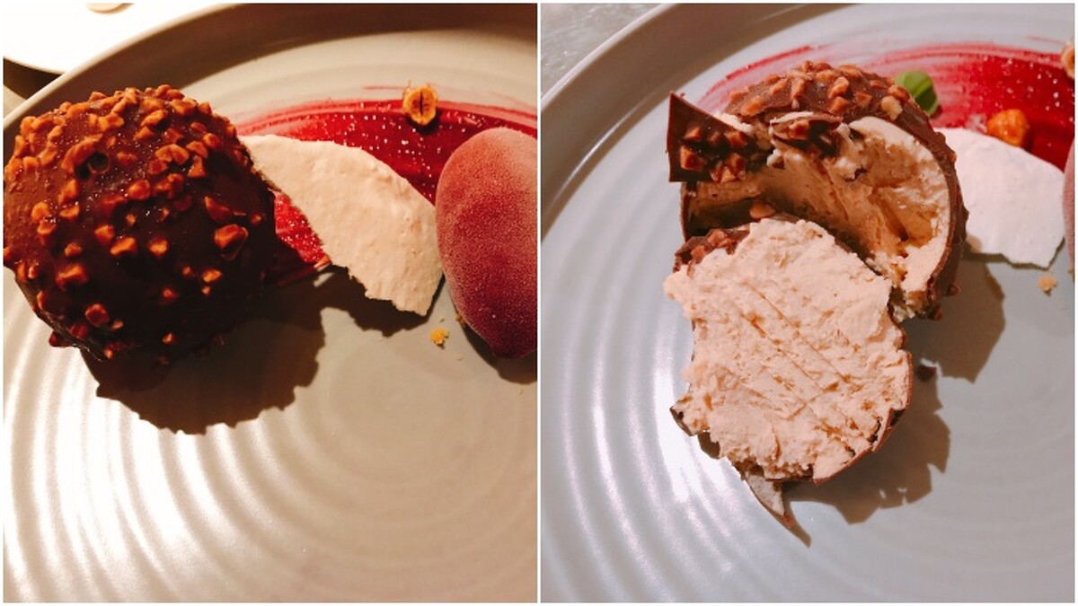 當然不能錯過美味的甜點榛果慕斯附黑醋栗冰沙,味道就像是加大版的金沙巧克力,加上酸酸甜甜的黑醋栗冰沙,甜而不膩讓人吃完還想再吃。