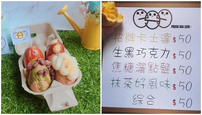 雞蛋糕共有5種口味,包含招牌卡士達、生黑巧克力、焦糖灑點鹽、抹茶好風味,老闆也貼心推出了綜合口味,每一個選擇都是50元。
