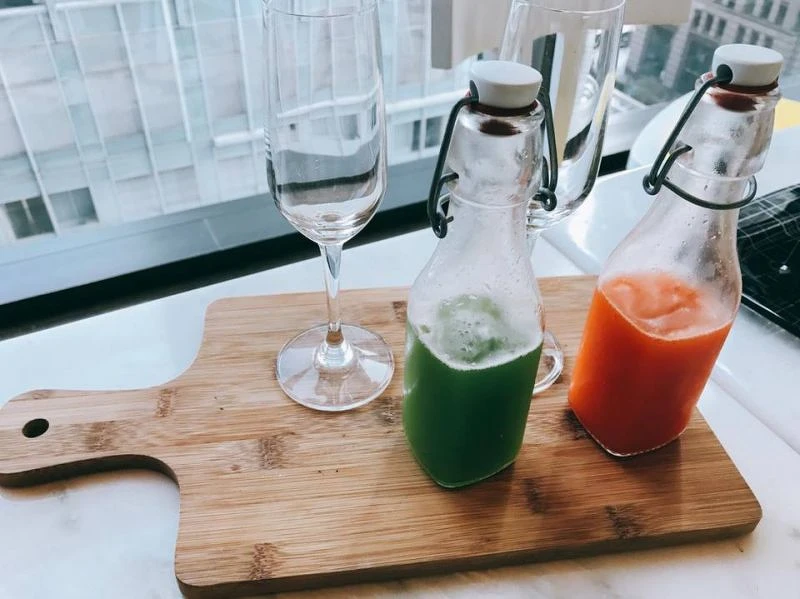 除了龍蝦主題餐點,WOOBAR酒吧經理李光曜 (Alex Lee) 還特別設計二款龍蝦調酒,包括綠色的「龍蝦青醬」以及「龍蝦紅醬」,二款調酒皆以龍蝦浸泡的伏特加和白酒為基底,超適合邊搭配餐點一口喝調酒。