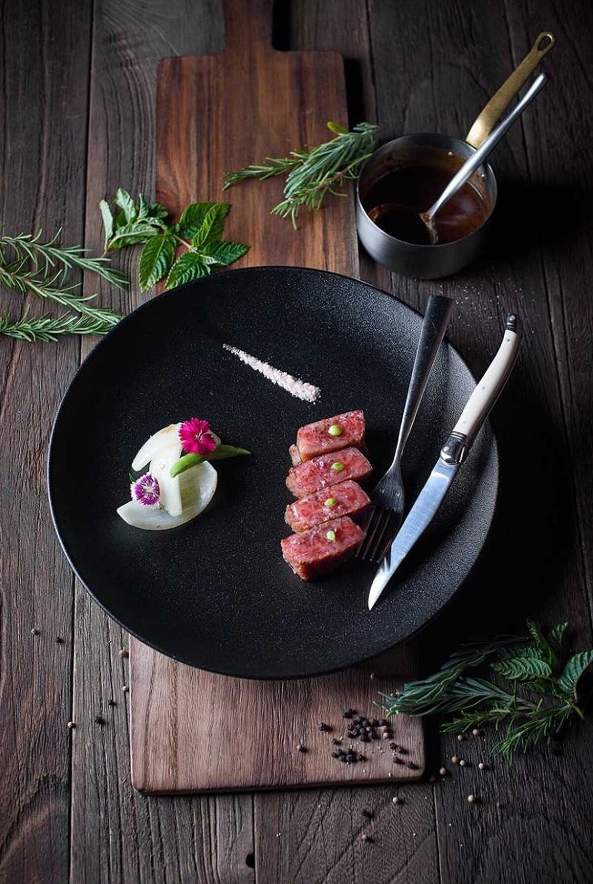 而在「GMT義法餐廳」,同樣選取最高規格A5等級的沙朗、菲力及上蓋老饕肉入菜,以香煎的方式煎至三分熟,僅添加些許海鹽調味,給予顧客品嚐神戶牛最原始的風味。