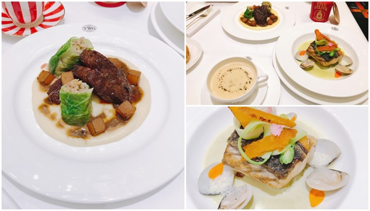 除了甜點之外,TWG Tea也即將於12月18日起到明年1月7日推出耶誕限定套餐,包含海鮮巧達湯、嫩煎美國Prime等級翼板牛排及香煎鱸魚(2選1)、白雪銀針及焦糖茶(2選1)、耶誕木材蛋糕。翼板牛排外表煎至焦香酥脆,但裡頭的肉質卻維持一定的嫩度,搭配綿密薯泥和約克火腿栗子燉菜卷非常有飽足感。香煎鱸魚與鹹香烏魚子的結合令人驚豔,鱸魚肉質鮮甜搭配烏魚子的香氣超級合拍。