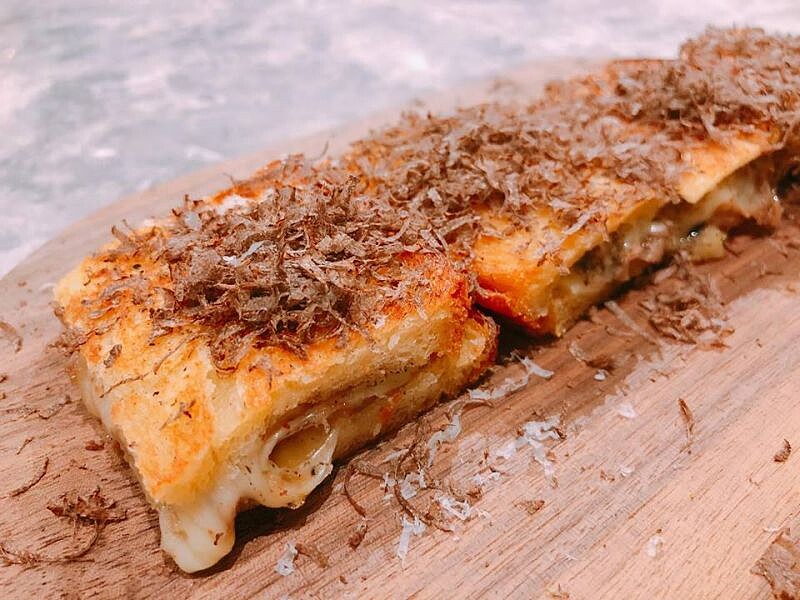 其中一款「松露下課三明治」,更是李主廚學生時期下課返家後自製點心的豪華升級版,充滿他的兒時回憶,是在柔軟的布里歐麵包中依序夾入手撕的油封鴨腿肉、康堤乳酪(Comté Cheese)與松露奶油,之後放上鐵板香煎至微酥,表層刨上適量黑松露即可上桌。