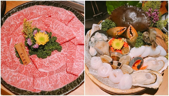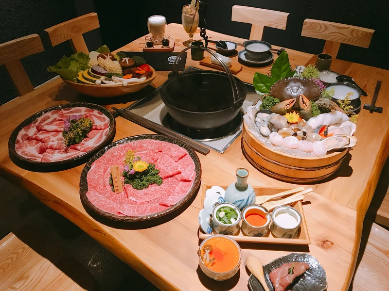 鍋物的湯底有分成昆布柴魚、野菜雞湯2種,套餐共有8種選擇,包含了澳洲和牛、日本和牛及海鮮等,如果不想吃海鮮也有全和牛套餐的選項。店內服務人員非常貼心,會依照進店用餐客人的需求,推薦不同內容的套餐。更走心的是,在這裡用餐能享有專屬鍋邊服務,不論是肉品或海鮮,服務人員都會幫忙烹煮,讓你可以享用到最新鮮、美味的食物。