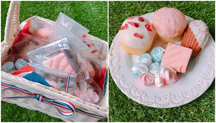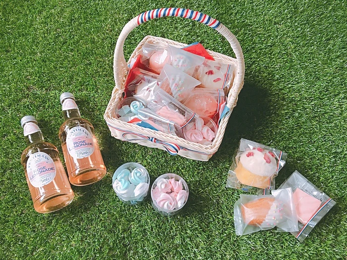 粉嫩法式花朵野餐組包含綻花巧克力瑪芬、巴黎薔薇蛋白餅、珍珠糖瑪德蓮、粉紅棉花糖布朗尼等小點,每組野餐籃更附上榛果巧克力醬,可以讓你跟姊妹們一起手作DIY,妝點出專屬的浪漫甜點。另外野餐組還可以加價購入英國FENTIMANS百年汽水。