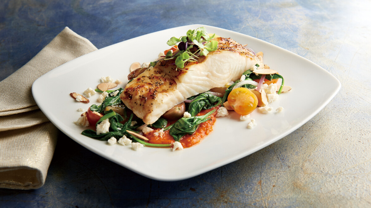 如果不吃牛可以選擇香煎比目魚佐烤紅椒醬,質地柔軟、味道溫和的比目魚,搭配大量蔬果、奶酪及堅果,在色澤鮮艷的西班牙烤紅椒堅果醬的烘托下,不論是香氣或口感,都是喜愛海鮮饕客的首選。