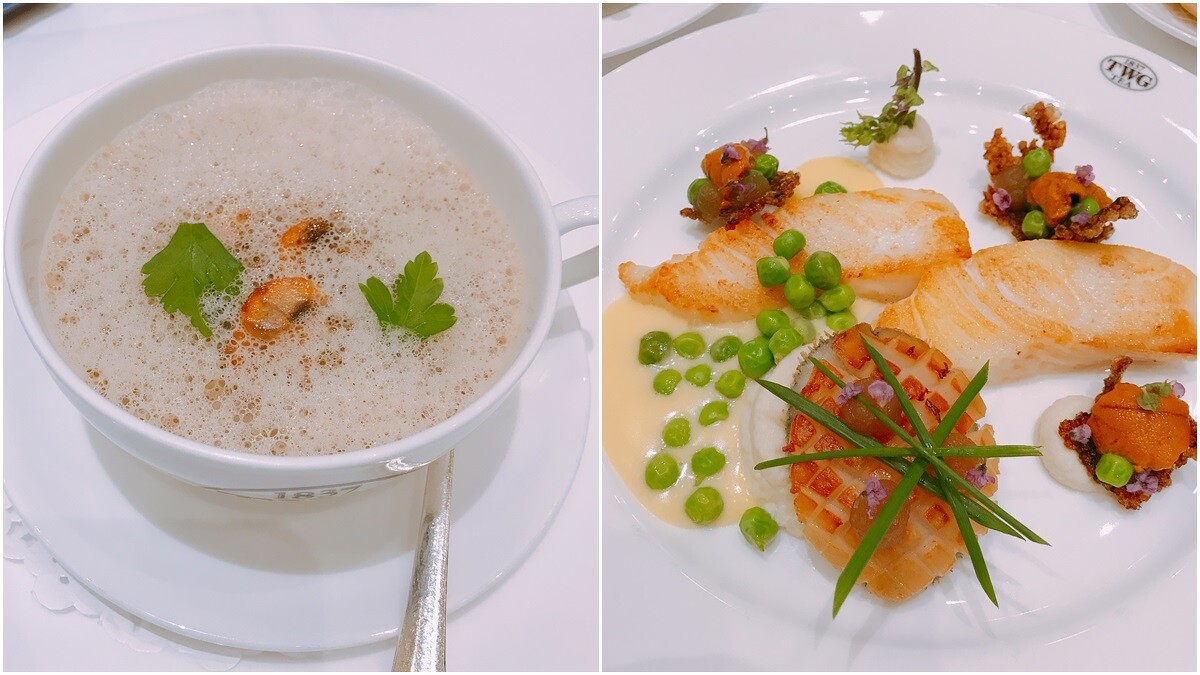 限定套餐以蘑菇濃湯佐龍之霧茶香泡沫揭開序幕,將大量蘑菇精粹成濃郁的湯品,上頭點綴龍之霧烏龍茶的泡沫。蘑菇濃湯非常濃郁,隱約帶有茶香味非常暖心。主餐則是清爽的香煎扁鱈魚及南非小鮑,佐生海膽昆布與艾方索黑茶凝凍,搭配筊白筍泥、碗豆仁與紫蘇花,附法式檸檬奶油醬汁。吃得到鮑魚、扁鱈的鮮甜原味,搭配昆布脆片與海膽一同入口,非常清爽且充滿海鮮的美味。