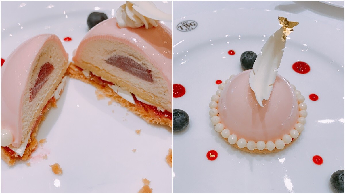 套餐所搭配的甜點也不是省油的燈,以金色玫瑰茶香玫瑰荔枝慕斯,佐荔枝覆盆莓果泥完美畫下句點。注入金色玫瑰茶的白巧克力慕斯,內鑲玫瑰荔枝凝凍,感受玫瑰花香與荔枝甜果在口中共舞,新鮮藍莓與荔枝覆盆莓果泥帶出一股清新沁酸,再以白巧克力製成的珍珠與羽毛及金箔妝點粉嫩嫩的外觀。