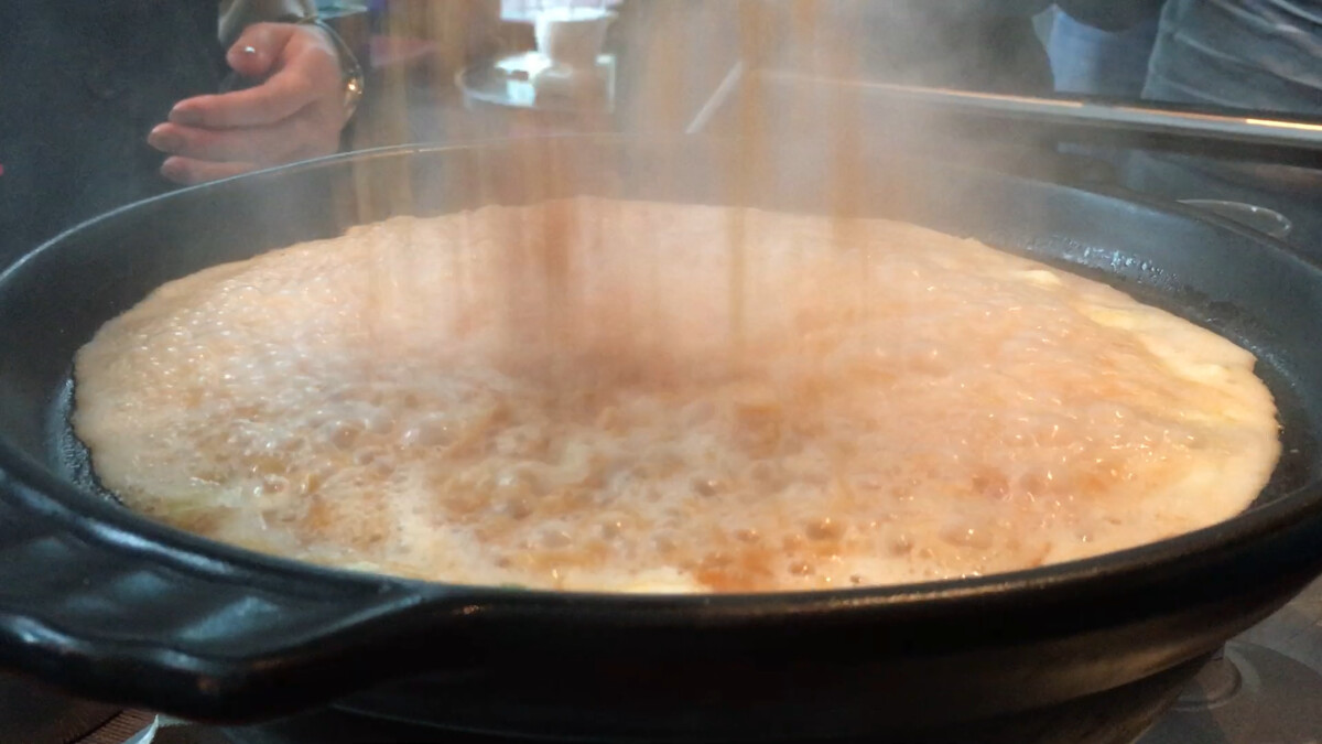 西施泡飯湯底龍用蝦殼、沙公、白蝦等食材炒香,提升鮮甜滋味,食材有北海道直送新鮮鱈場蟹與干貝,絲瓜、芹菜、青江菜和鮮菇,熱騰騰鮮美海為湯底上桌後,桌邊人員會倒入炸香米,瞬間酥香的炸米,就會在鍋中跳起跳跳舞來,炸出空氣孔的香米吸入鮮甜湯頭,口感滋味實在太難忘,視覺味覺都是頂級海味。