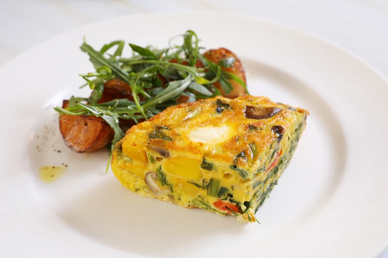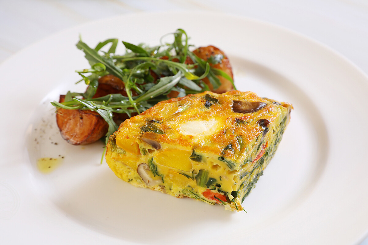 COVA精選5道再義式不過的經典食譜,義式火腿蔬菜烘蛋以厚厚的烘蛋夾入火腿、菠菜、芝麻葉、蘑菇、番茄等新鮮食材。