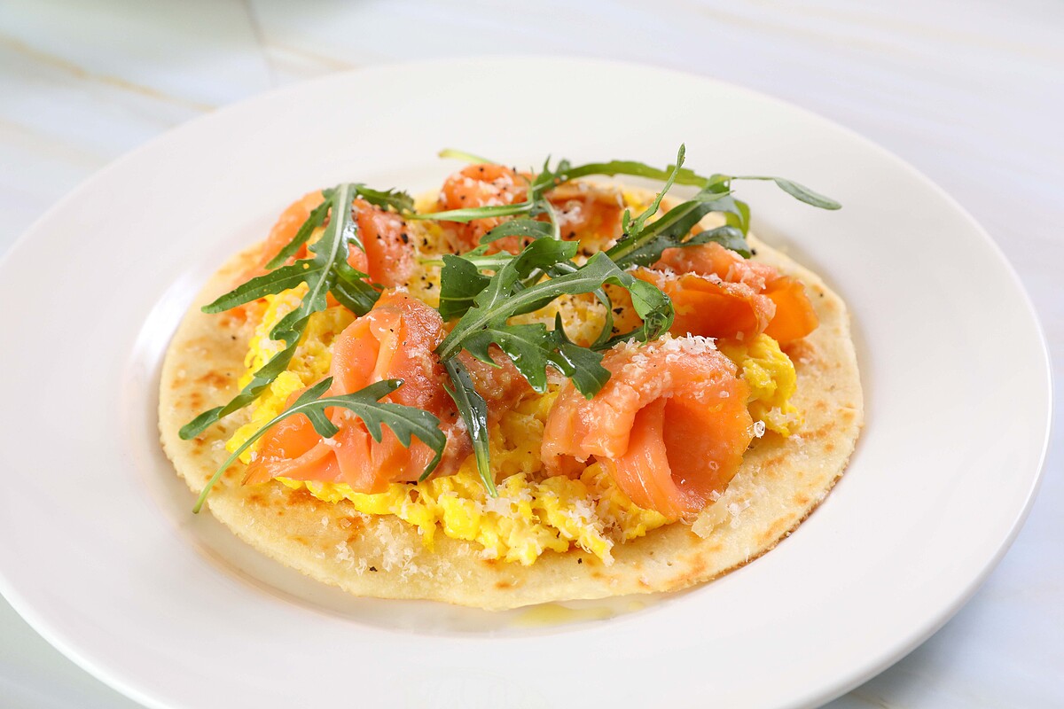 煙燻鮭魚及起司炒蛋配比薩薄餅則是一道傳統庶民美食,手桿餅皮經過悉心烘烤,香而不焦、脆而不乾,鋪上燻鮭魚、芝麻葉、炒蛋、起司。