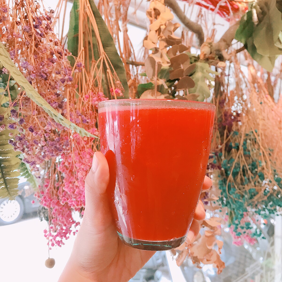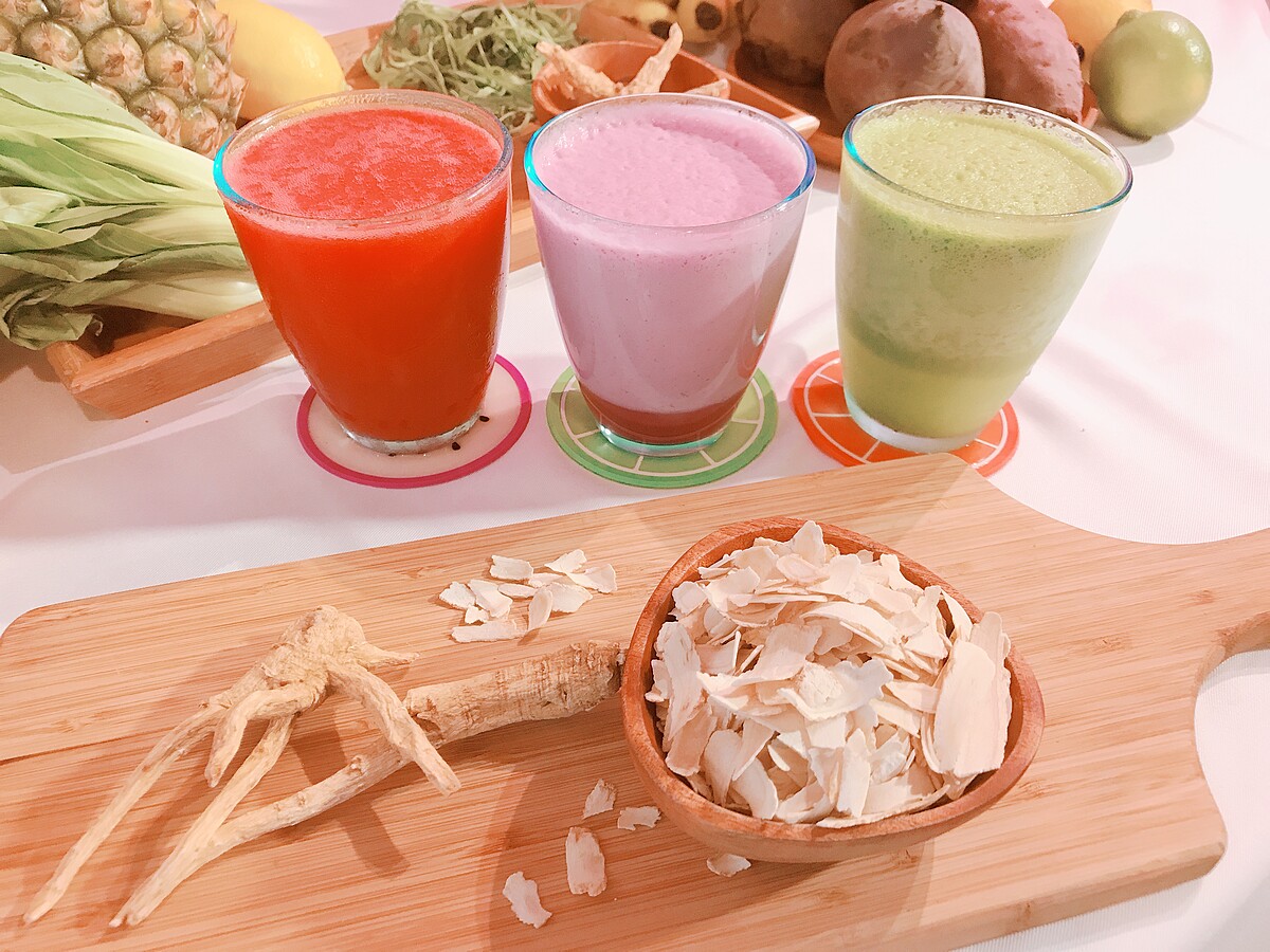 素材:甜菜30公克、胡蘿蔔50公克、蘋果70公克、檸檬汁1湯匙、蜂蜜2湯匙、1/4匙西洋參粉,及140毫升冷開水與少量冰塊