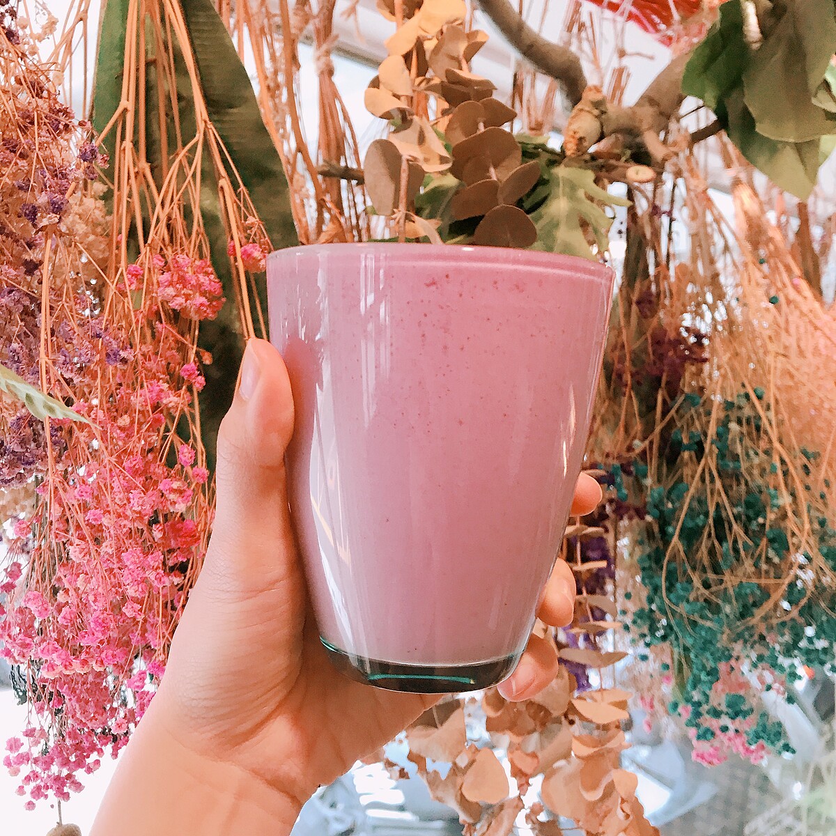 素材:地瓜泥50公克、草莓140公克、牛奶100毫升、乳清蛋白1/2匙、1/4匙西洋參粉,及150毫升冷開水