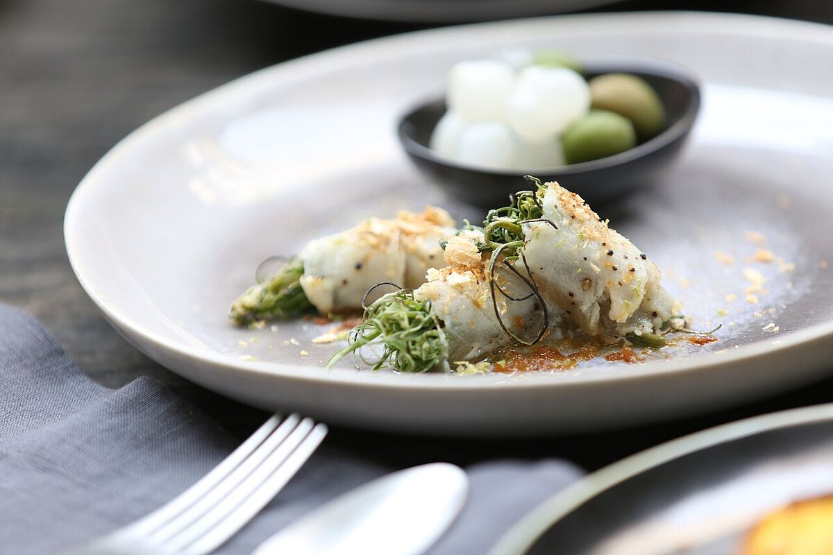 炙燒旗魚捲TIPS:在市場買魚,請魚攤老闆提供可生食級魚肉,可保證新鮮美味。旗魚是容易取得、價格合宜、兼具口感豐富的魚鮮,準備切之前可以先冷凍一下,微凍的硬度,下刀切薄片會更順手;魚肉醃漬搭配漬昆布汁龍鬚菜,也可依循時令,選擇適合鮮蔬如櫛瓜燙過後再以酸甜風味冰鎮漬物非常開胃。將胡椒鹽與橄欖油先醃漬過魚片捲上龍鬚菜,再以炙燒槍炙烤上色,為魚片增添戶外燒烤的煙燻風情。最後以日本柚子醬油增添優雅風味,點上麵包碎再刨上綠萊姆皮增加脆口感即完成。
