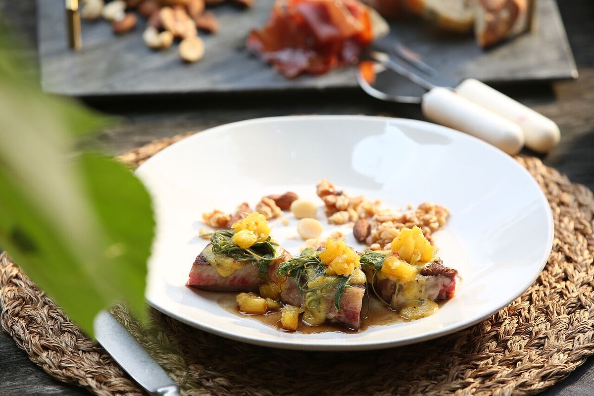 舒肥牛排TIPS:時下流行的舒肥烹調,更適合野炊烹調時利用,增加餐點效率,縮短烹煮時間。將鼠尾草鹽巴胡椒與橄欖油與牛排一同放入舒肥袋中,以攝氏55-65度溫度低溫烹調前製。牛排放入燒熱鍋中,肉一下有吱吱聲,就表示鍋子熱度足夠囉。將鐵鍋燒熱後,兩面交互熱煎封住肉汁轉小火慢煎至表面微焦金黃。煎好後放在肉板上休息一分鐘左右,可以讓肉質更緊縮彈口。最後將牛肉切成適口大小。佐以時令新鮮鳳梨與蒜頭辣椒調成的酸鹹風味醬汁,加上季節蔬菜及香草堆疊,成為一口可食的Finger Food,保證是餐桌上最受歡迎的話題主菜。