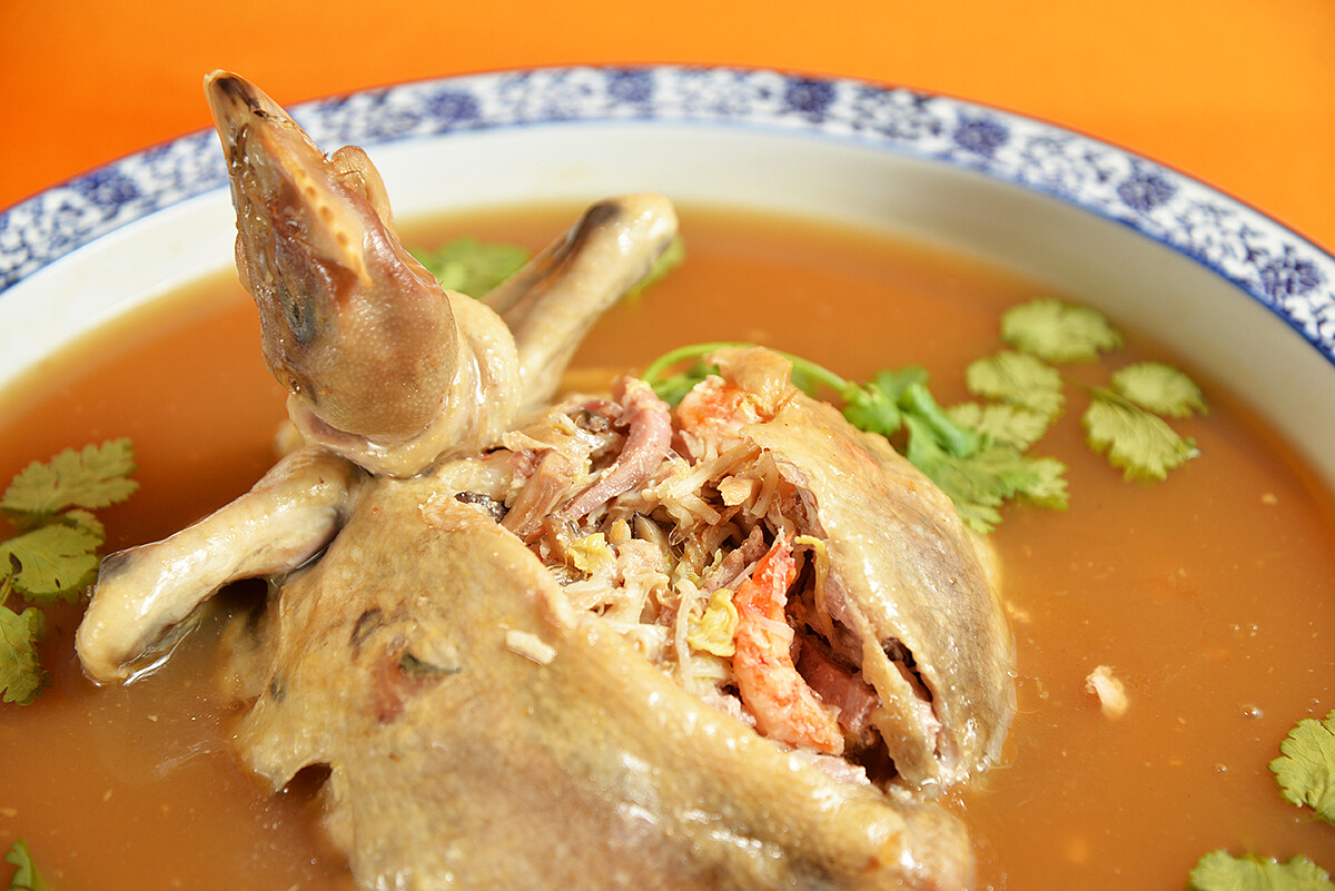 大器的宴客菜不只盤子都要大到服務人員使盡全力捧上桌,而且每道菜都各有乾坤,才是視覺與味覺的過癮之處:厲害的布袋雞,將雞骨和肉全剔除不用,保留頭、腳維持外表完整,以為是一到水煮雞,結果竟然是考驗師傅刀功將清燉雞身體內塞入紅燒羹彭湃好料,這就是阿舍家經典的套疊菜色,吃的是一盤霸氣;或者把白蘿蔔燉得軟潤如白玉後,堆疊上各種蔬菜勾芡的白玉鳳眼,則是漂亮富貴、流傳百年的嫁妝菜。