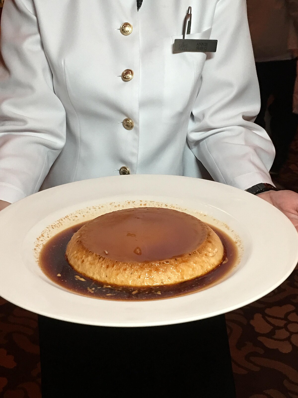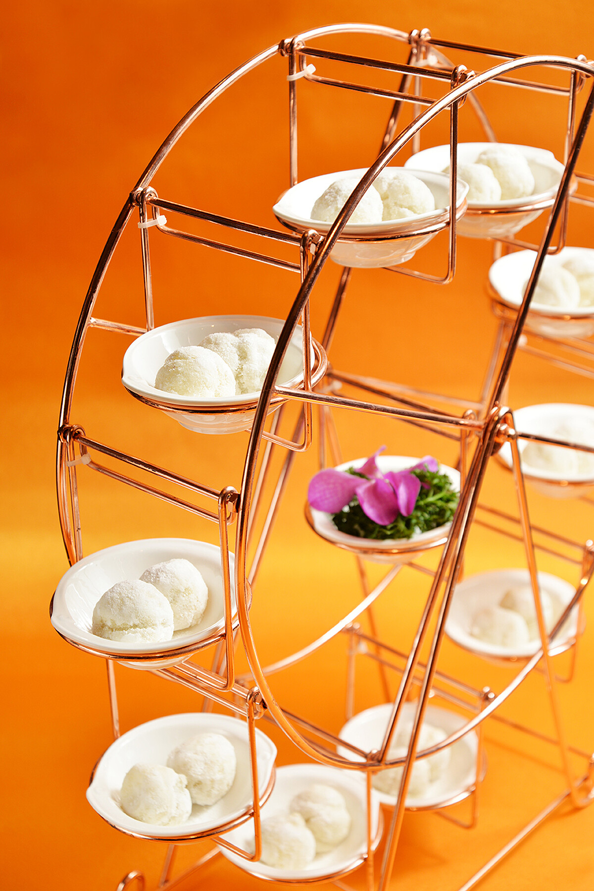 戲劇張力滿點的摩天輪金銀圓棗白糖粿,只要拿起一碟摩天輪就開始轉動起來,小孩大人都會嘖嘖稱奇;還有小時候去冰攤仔吃剉冰一定要加一顆的古早味蒸布丁,在宴客桌上也是一大盤以慢火精炒砂糖,搭配雞蛋與鮮奶蒸煮,滿滿的雞蛋香又入口即化,甘甜美麗的琥珀焦糖汁,就算吃到呼吸困難也要留出空隙塞甜點。因為菜式實在太多太豐富,飯店連老台灣的打包文化都一併貼心想好,準備了打包帶讓賓客有吃又有拿。