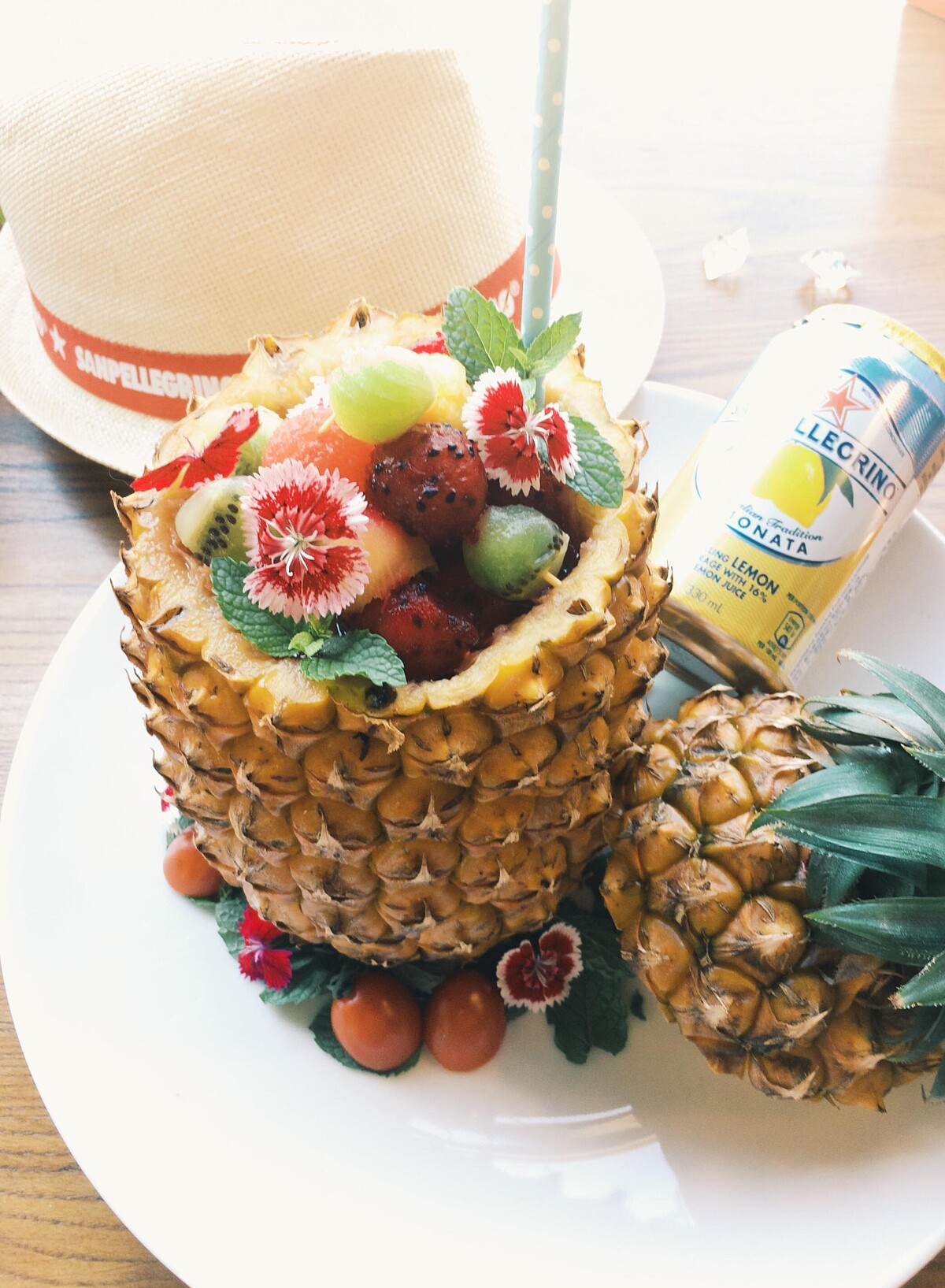 很適合家庭派對的造型調飲,就用Sanpellegrino紅橙口味水果氣泡飲、 鳳梨、火龍果各1顆、奇異果2顆、蜂蜜及檸檬汁適量的「繽紛沙灘」,倒入挖空的鳳梨盅點綴可食花,自己再加上水果串,看起來就超厲害。而且這都是可以輕鬆在超市超商找到食材調製的風格飲,是不是想動手試試看了呢。義大利聖沛黎洛天然氣泡水果飲,所有風味每罐定價均為TWD 50。