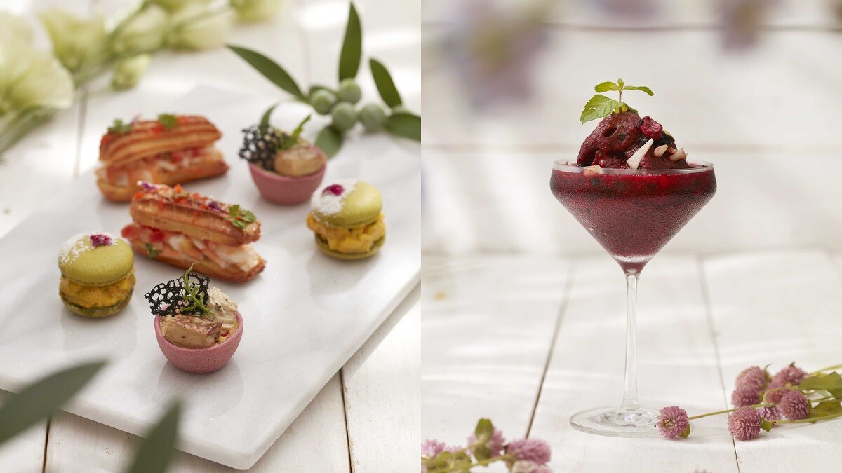 除了3款香氛系甜點,還有一款藍莓檸檬瑪琳巧克力塔甜點、與3款鹹點:番茄莎莎鮮蝦閃電泡芙、咖哩風味干貝蟹肉馬卡龍、法式鴨肝松露起司塔,搭配飯店吧台特調的兩款夏季飲品,有以Midori蜜瓜香甜酒融合奇異果與萊姆的輕酸果香,加上義大利氣泡酒Prosecco所打造的微酒精飲品「城市綠影」;或是以覆盆莓果與鳳梨、蘋果粒打造出沁涼果泥冰沙的「繽紛嫣紅」,下午茶搭配冰沙或微酒精飲料的組合,根本就是最幸福放鬆的午後了。