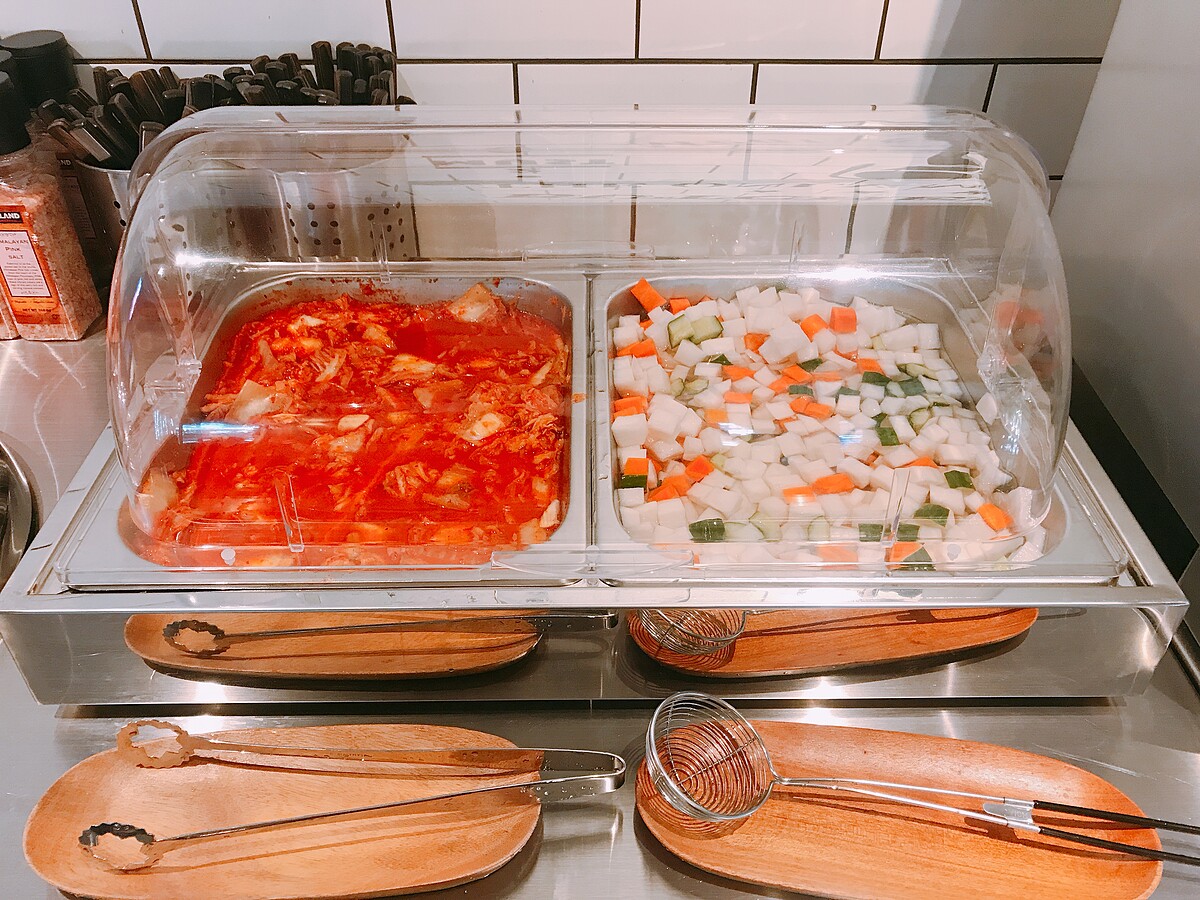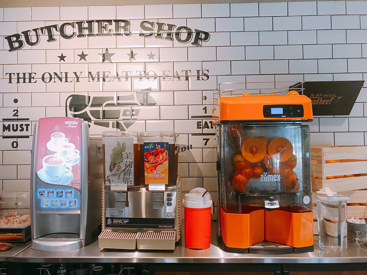 點完餐後可以先取用很牛炭燒牛排提供的餐前自助吧,提供手作小菜、2款湯品、各式冷、熱飲,台北東興店還獨家引進新鮮柳橙汁機,可以喝到現榨的新鮮果汁。
