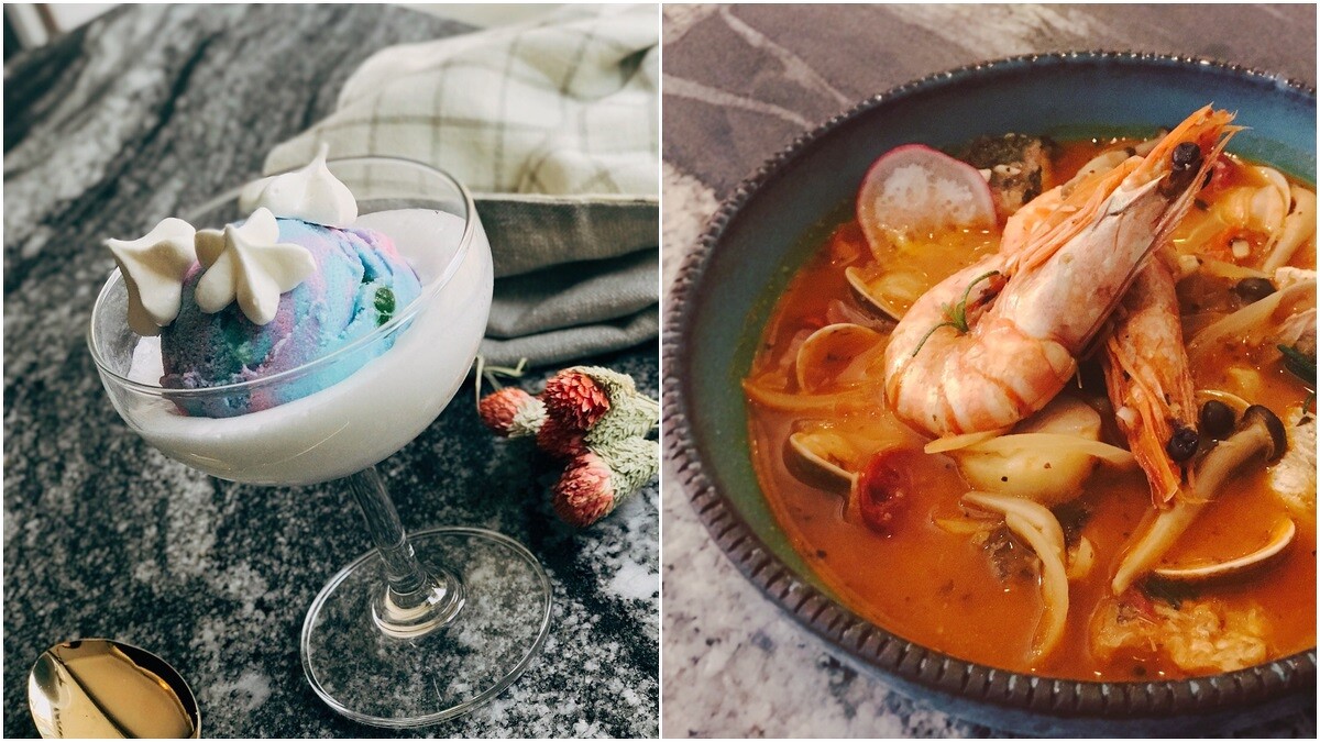 主餐一共有4款含虎姑婆黑暗料理、鮮蝦蛤蠣酸甜義大利麵、松坂香蒜燉飯及泰菲椰爺紅咖哩燉飯,每一道都是店家獨創的料理。其中,虎菇婆暗黑料理將牛肉處理的細緻鮮嫩,與燉飯結合口感極佳,非常推薦大家試試看。
