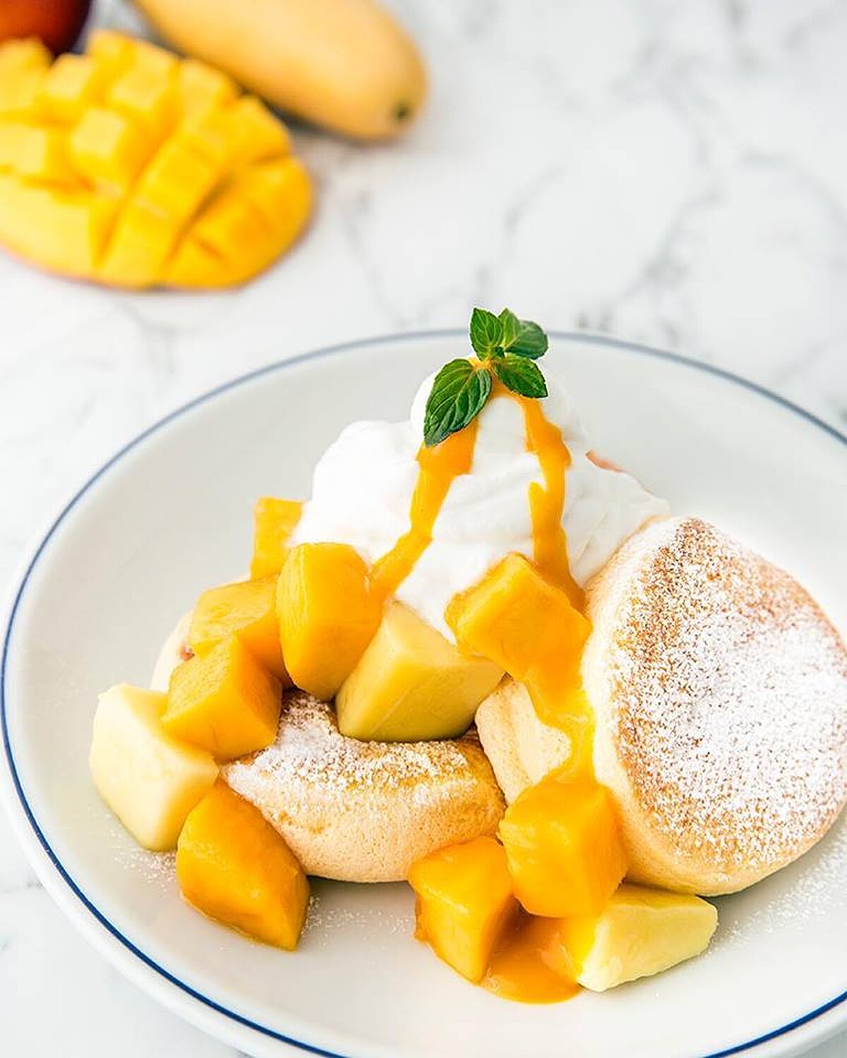 另個必吃不能錯過的季節美味限定--芒果雪酪舒芙蕾鬆餅,使用多重口感呈現芒果香甜多汁的極致美味:愛文芒果以及果肉扎實的金煌芒果兩種品種切成大口塊狀,再加上冰凍芒果塊和芒果雪酪冰淇 淋,滑口的多汁的冰鎮的香濃的芒果肉,遇上三大塊鬆軟香綿、在日本被譽為奇蹟的舒芙蕾鬆餅,最棒的還有日本主廚特製空氣般輕盈鮮奶油,絕對一吃上癮一口直奔天堂。