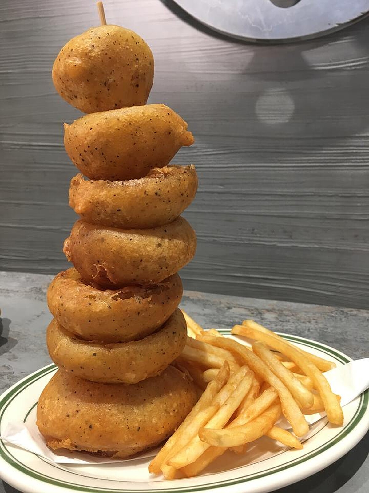 店上人氣必推,還有約二十公分高的洋蔥塔。選自美國洋蔥,現點現炸。足足有七塊的洋蔥圈,沾上完整的香料麵衣後,炸出宛如穿上可愛蓬裙、外脆香內水嫩的洋蔥圈,接著依據洋蔥由大至小堆疊成塔,再和塔塔醬與薯條一起大盤上桌,從廚房端出到上桌,總會吸引大家的目光,甚至立即引發熱點潮呢。
