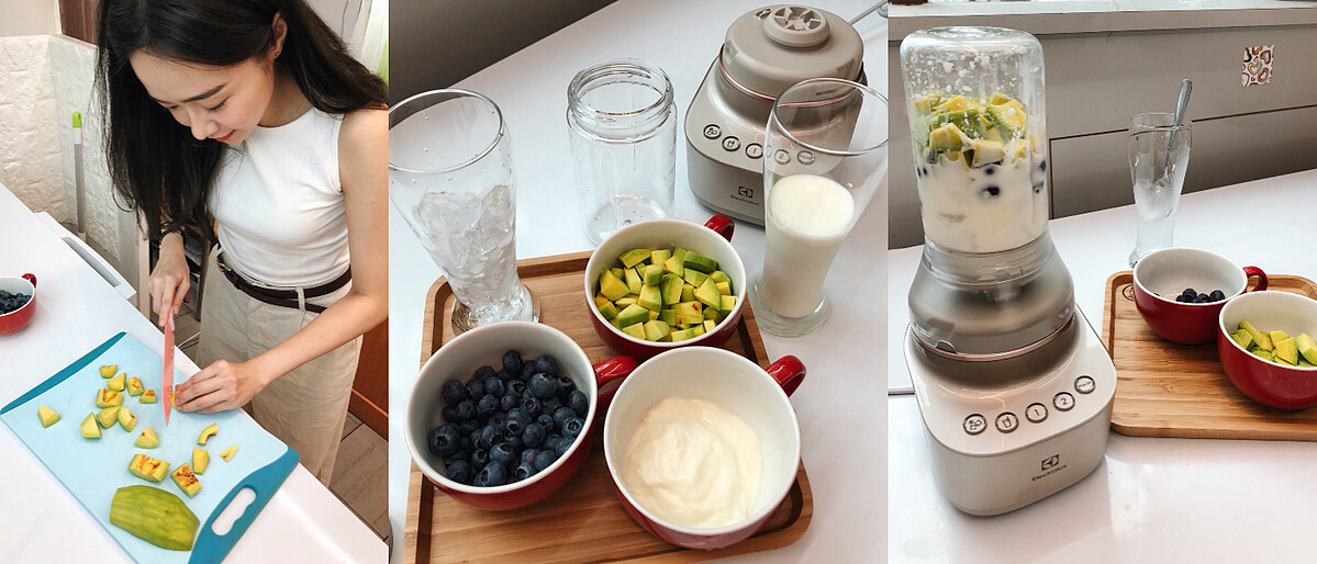 準備好食材後就全部交給伊萊克斯囉!優格跟酪梨能增加飽足感,直接把食材通通丟進去打,一杯直接把早餐抵掉健康又快速,不用更換杯子,好好喝的MIKA特調直接輕鬆帶著走,昨天準備的冷凝棒能讓果汁保冷一小時,是不是很方便~平常和大家分享那麼多保養方式,但除了外在,由內而外的養顏養生也是很重要的唷!