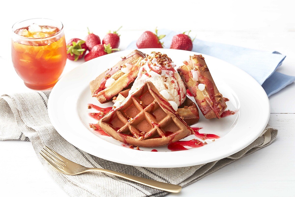 更讓人著迷的是「玫瑰鹽法式香草風味冰淇淋鬆餅」,現點現烤的鬆餅以100%牛奶製成,外層香酥、內餡鬆軟並融入Q彈麻糬,綴以法國依思妮焦糖海鹽碎片;淋上新鮮熬煮的草莓醬,多層次的細緻口感勾人心弦,入口每一瞬間都散發誘人魔力!