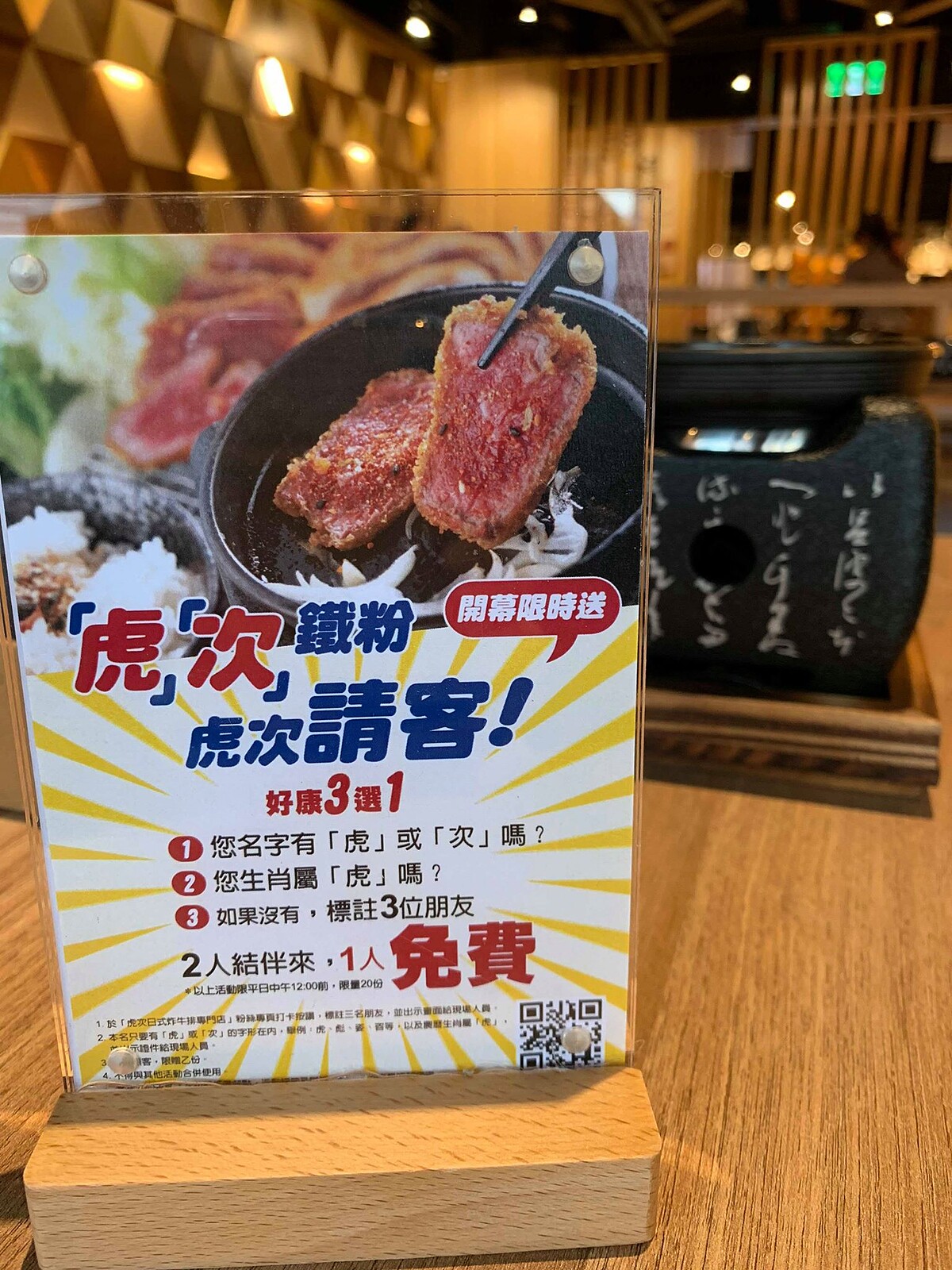 最後甜點部分則有水信玄餅以及布丁可選,此外,為了歡慶開幕,開幕期間推出「虎次鐵粉、虎次請客」活動,本名裡有「虎」「次」的字形,或是生肖屬「虎」,以及只要在虎次Att粉絲專頁打卡,同時另外標註三位麻吉好友,只要符合上述任一條件立即享主餐買一送一優惠!活動自10月18日至10月31日,平日12點前限量二十組。