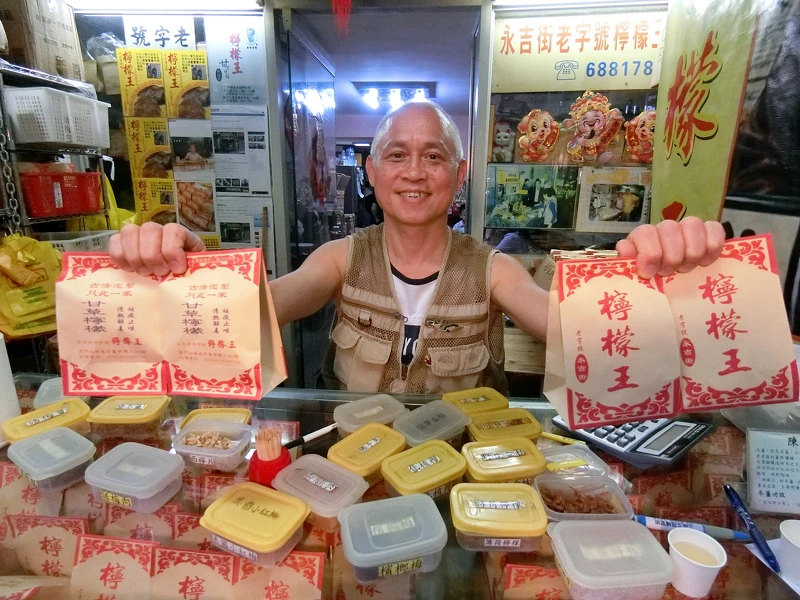 位在大三巴牌坊附近的永吉街老字號「檸檬王」,可是好幾年米其林指南推薦的名店,非常多客人慕名而來,附近可以看到許多提著檸檬王的旅客,這裡也是同事代購最熱烈的一站,第二代老闆陳永華說每天都會泡茶給客人喝,先奉上一杯茶給來到檸檬王的客人,當天喝到的是川貝檸檬和陳皮的潤喉組合,讓客人在選購時感到親切和舒適。