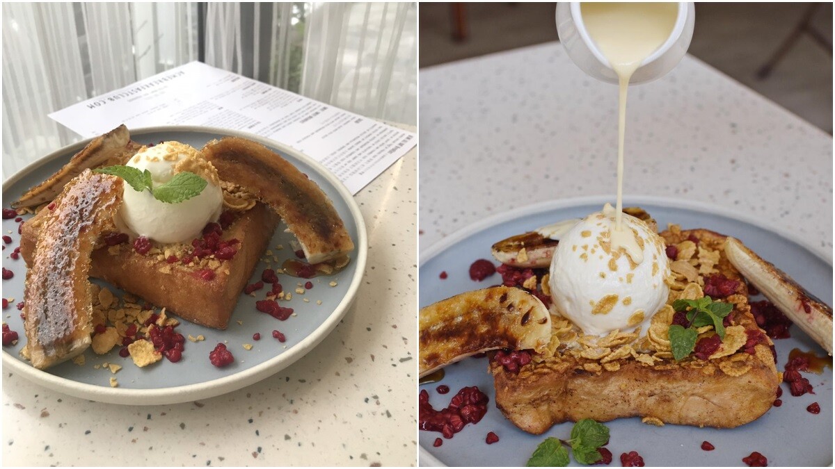 選具口感扎實的厚片奶香吐司,並以特調蛋液完整浸泡,讓每一口都吃得到濃郁的蛋香,接著沾上穀片碎片,再將雙面煎至焦黃香脆,讓內裏吃起來就像棉花糖般的綿密,散發陣陣香草莢和肉桂香氣,最後撒上蜂蜜脆片和酸甜覆盆子,並淋上自製白巧克力醬,脆片頓時婉如雪花灑落落,搭配焦糖化的新鮮香蕉,讓每一口更豐富、美味。