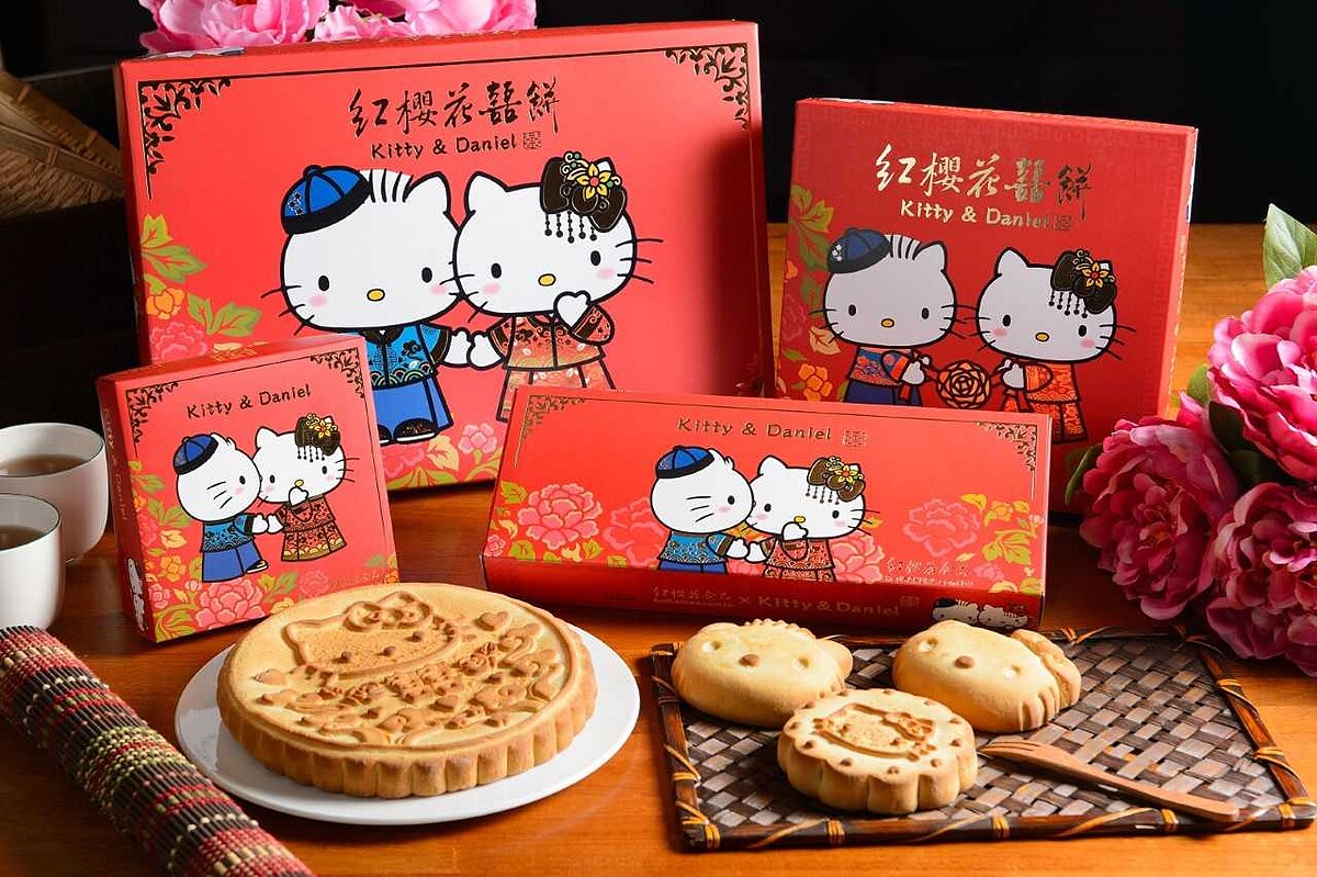 可以看到KITTY中式囍餅上有DANIEL與KITTY這對佳偶身穿可愛旗袍的造型,囍餅本身更有六種口味可供選擇,提供結婚或送禮不一樣的選擇。